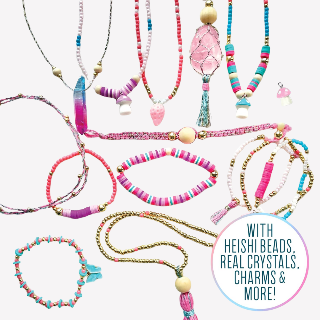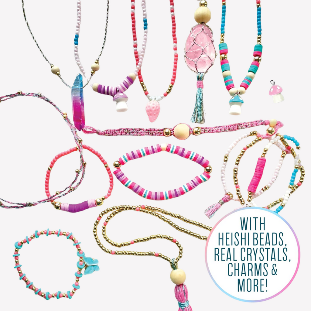 • Heishi beads, real crystals, mushroom, strawberry and butterfly and other assorted charms