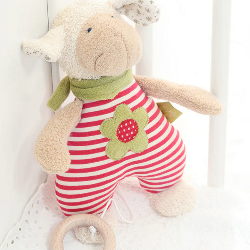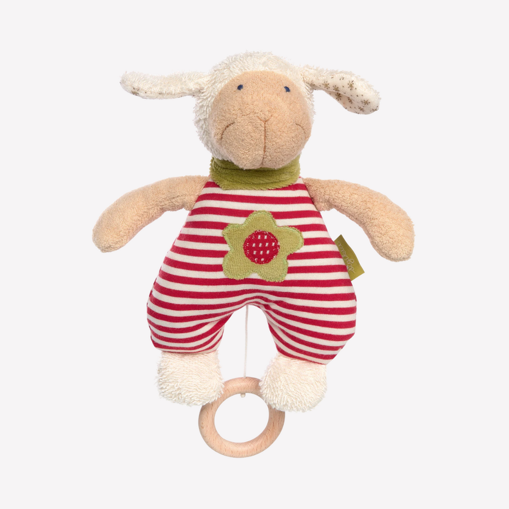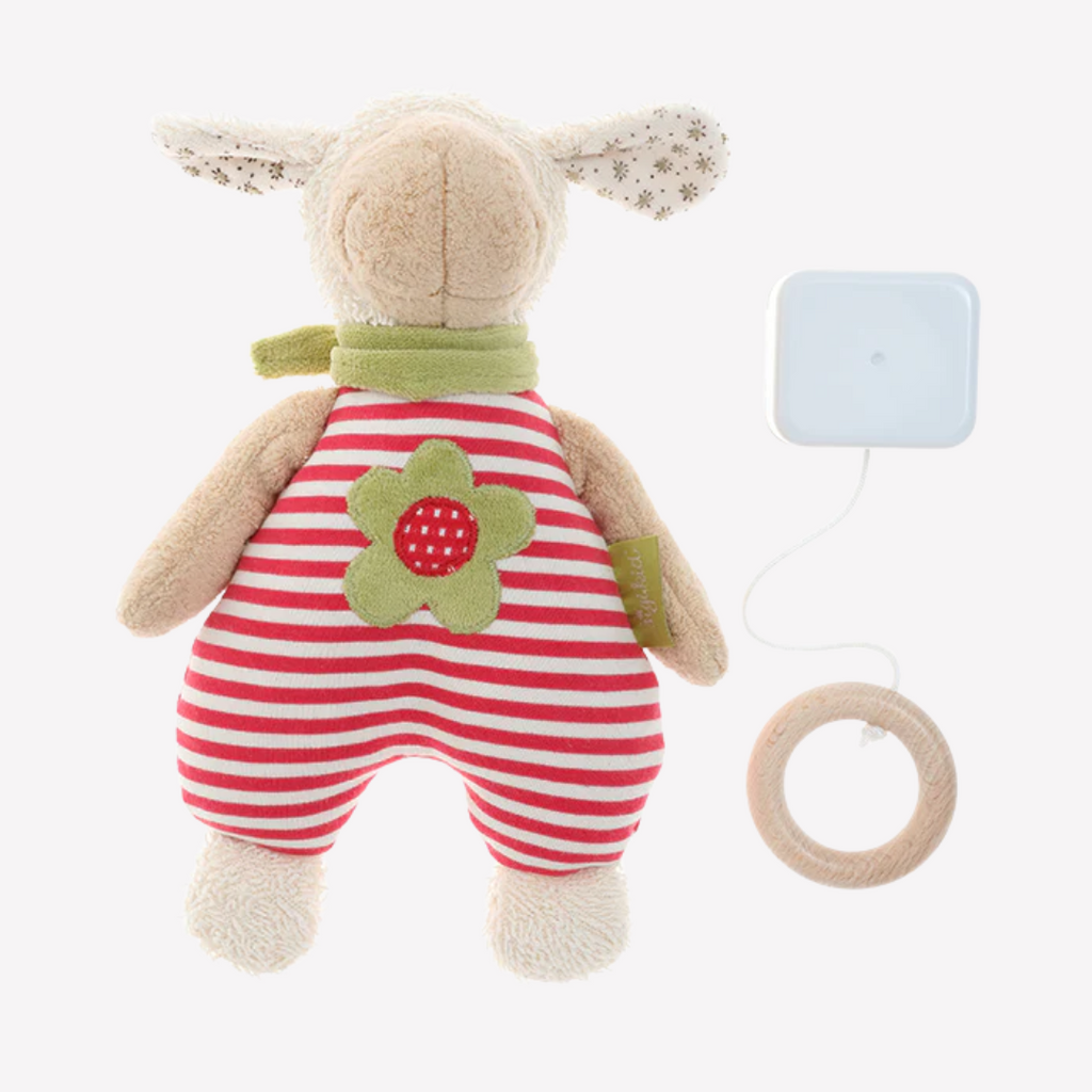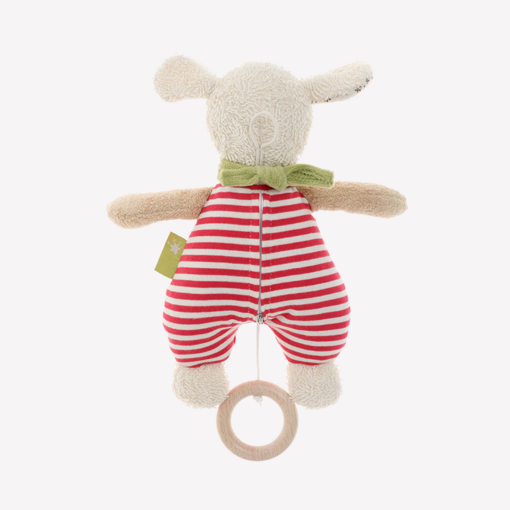 Cuddles and lullabies make babies happy! This charming sheep is perfect for little hands to grasp, cuddle and snuggle. The soft music will soothe and delight. An ideal companion from the first hours through bedtime, naptime or anytime. Perfect for babies with sensitive skin.
