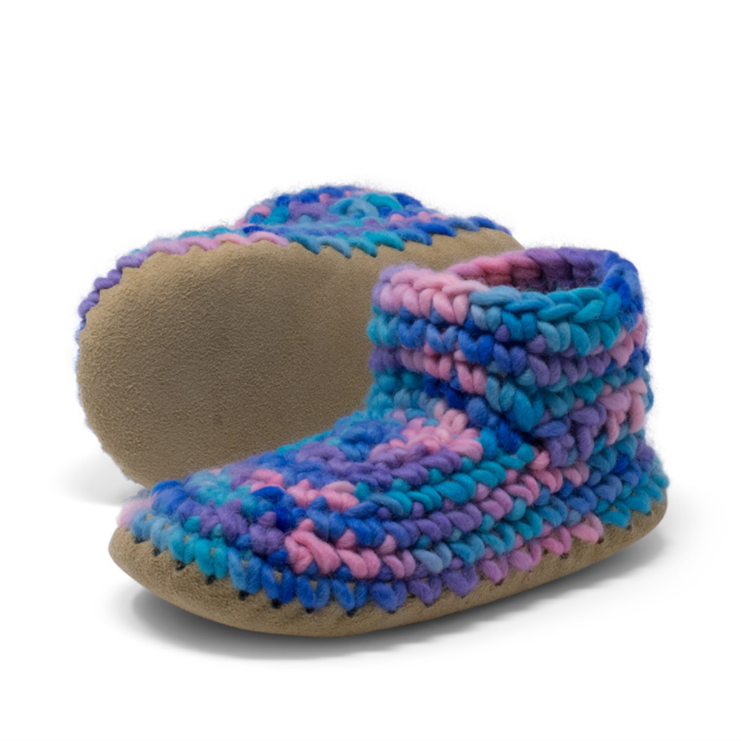 These wonderful hand-dyed wool crocheted slippers are made by a family business in Canada. Padraig slippers are an all-purpose slipper with a great sheepskin soling concept that that are often used for moccasins. Innersoles are soft, genuine sheepskin, and outer soles feature non-slip suede. You will appreciate how easily it slips on and off. Read less