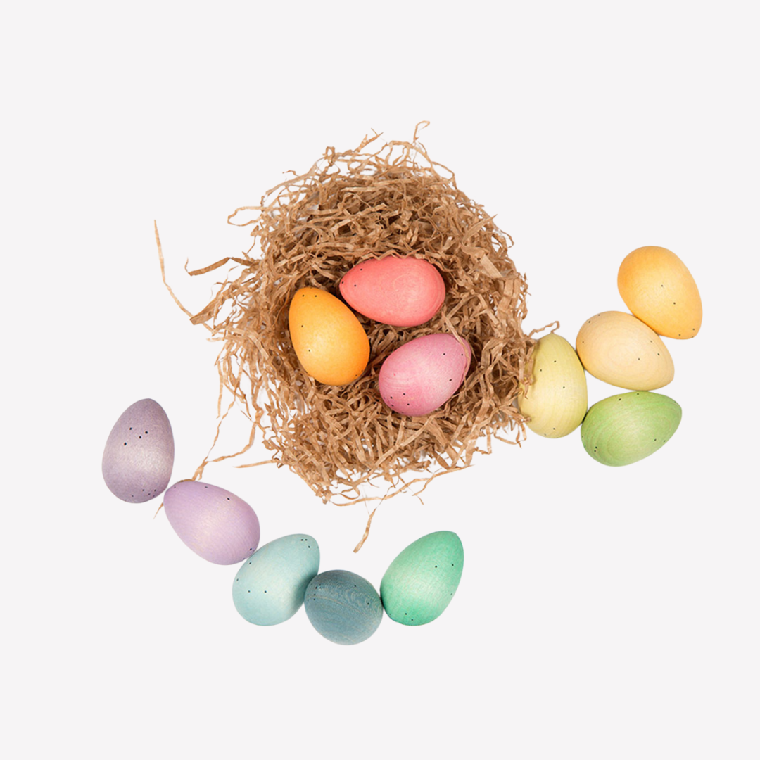 This wonderfully colorful set of eggs will engage and inspire children to think about nature. Perhaps there is a baby bird inside, a colorful breakfast or a nest? A subtle, sweet addition to holiday displays.