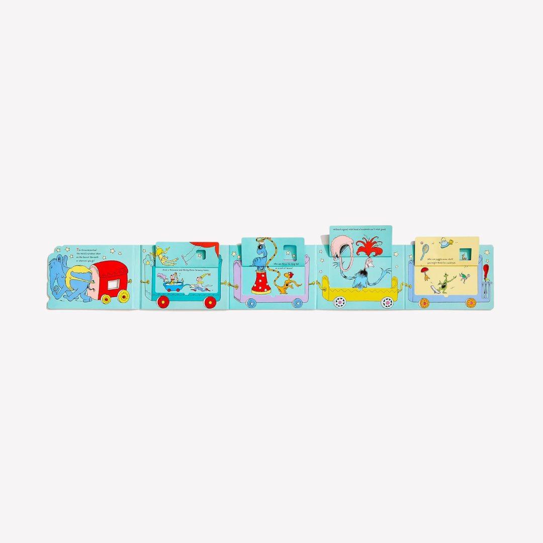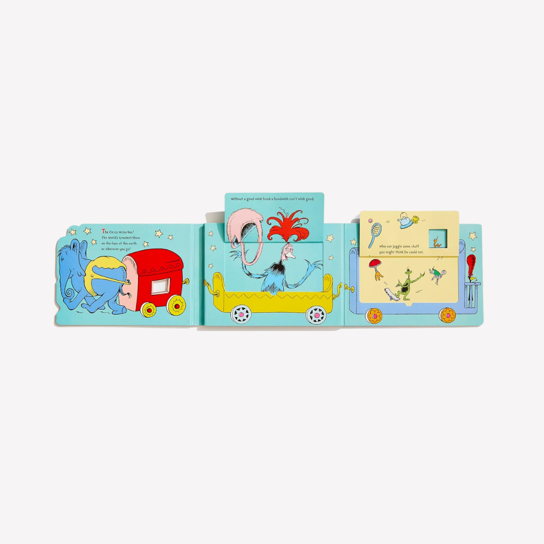 Unfold the pages, lift the flaps and let the excitement begin! Sturdy board pages and an accordion binding lets the fun unfold. With jugglers, clowns and acrobats, this Seussian circus train is sure to astound and amaze! Characters in bold and simple formats will engage babies and toddlers at each stage of development.
