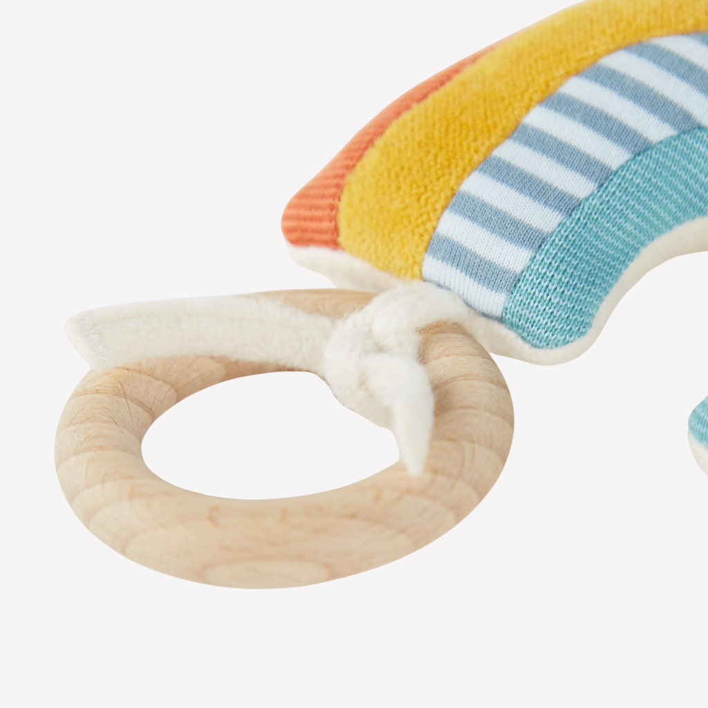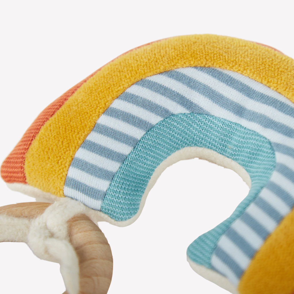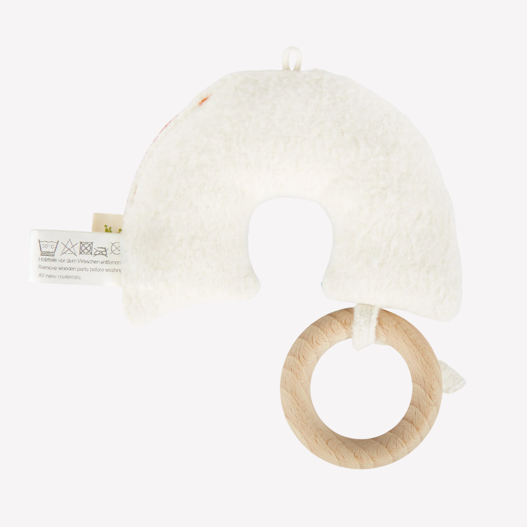 Cuddles and sounds make babies happy! This colorful rainbow is perfect for little hands to grasp, cuddle and snuggle. The soft sounds will soothe and delight. An ideal companion from the first hours through bedtime, naptime or anytime. Perfect for babies with sensitive skin.